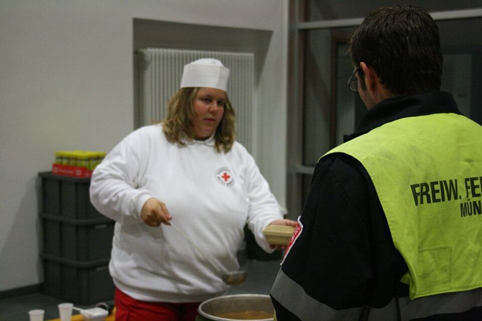 Kurz nach 22 Uhr wurde die Schnelleinsatzgruppe Betreuungsdienst des Münchner Roten Kreuzes alarmiert, um die ca. 300 Einsatzkräfte mit heißen Getränken und einer warmen Mahlzeit zu versorgen. Dazu errichteten ein Teil der 22 ehrenamtlichen Helfer auf dem Messegelände eine Ausgabestelle für Essen und Getränke, während andere im Katastrophenschutzzentrum an der Boschetsriederstraße mit der Zubereitung der warmen Mahlzeit beschäftigt waren. Der Einsatz dauerte bis in den frühen Morgen hinein.