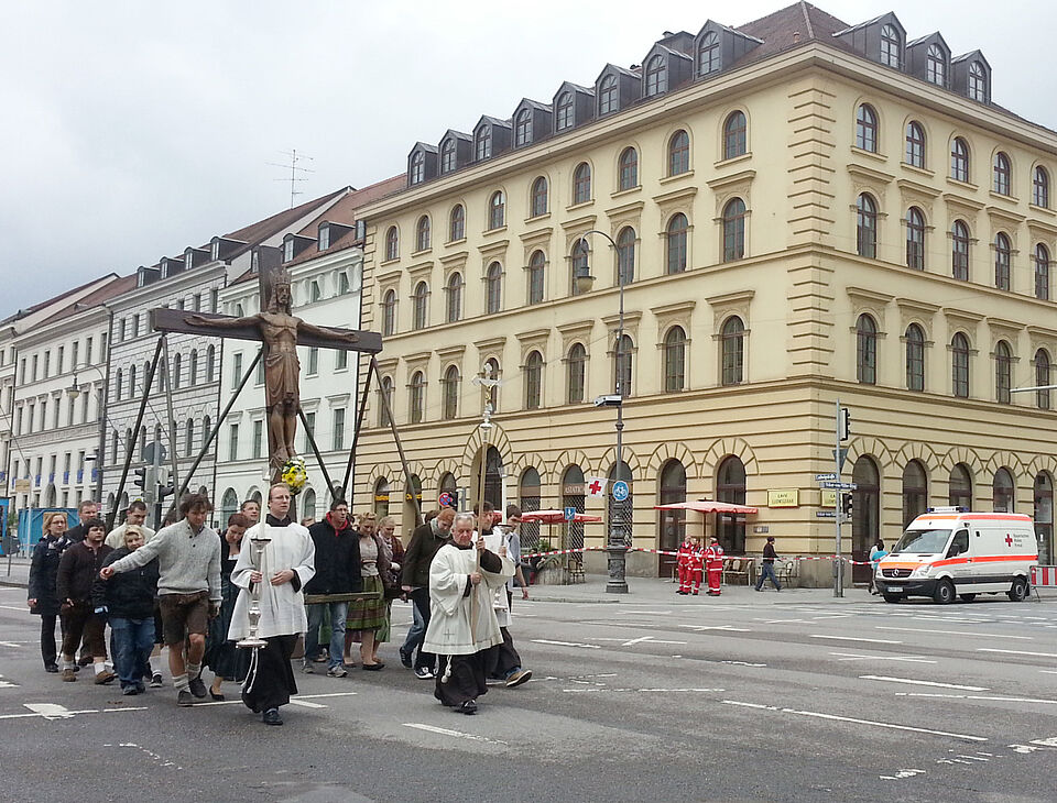 Rund 4.000 Teilnehmer beteiligten sich an der Prozession durch die Münchner Innenstadt, darunter auch Paul Poyfka (Vorsitzender des Münchner Roten Kreuzes) und Jürgen Terstappen (Kreisbereitschaftsleiter).