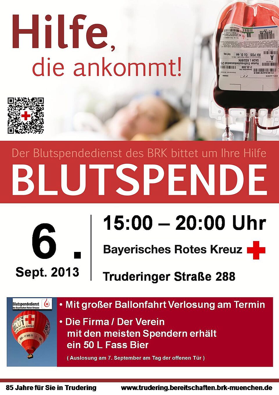 Retten Sie Leben - spenden Sie Blut! Unter allen Spendern werden 4 Ballonfahrten verslot (Verlosung am 07.09.13 beim Tag der offenen Tür). Außerdem erhält der Verein bzw. die Firma mit den meisten Blutspendern ein besonderes Geschenk. Für das leibliche Wohl nicht nur der Blutspender ist gesorgt. Und natürlich können Sie sich auch über die ehrenamtliche Arbeit des Münchner Roten Kreuzes informieren.