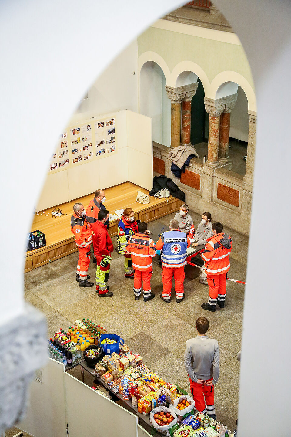 Im Auftrag des Sozialreferats der Stadt München haben die Münchner Hilfsorganisationen vorigen Donnerstag die Akutbetreuungsstelle im Luisengymnasium eingerichtet. So wurden in Klassenzimmern und Turnhallen Feldbetten aufgestellt, Ausgabestationen für Lebensmittel aufgebaut, Räumlichkeiten für medizinische Versorgung und Covid-19-Testungen ertüchtigt. Die Kapazität der Notschlafstelle umfasst ca. 350 Plätze.