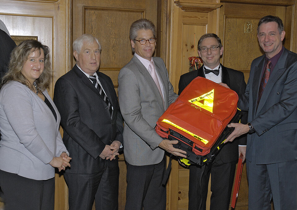 Anlässlich der Jahresabschlussfeier des Roten Kreuzes in Aubing übergaben Günter Grafoner und Ernst Dieter Zirk von der Allianz die neue Ausrüstung an die Bereitschaft München West 3 Aubing des Roten Kreuzes. Deren Leiter Roland Ahl bedankte sich für die Spende, die den schnellen Rettern wieder ein adäquates Handwerkszeug zur Seite stellt. Die Unterstützung der Allianz-Versicherung ist Teil des gesellschaftlichen Engagements des Unternehmens, in dem es unter anderem Projekte fördert, die zur Sicherheit der Bevölkerung beitragen.