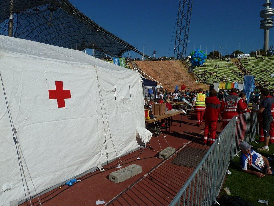 Radl-Sanis mit. Mehrere mobile Notärzte waren zudem jederzeit bereit, um im Ernstfall entlang der Strecke eingreifen zu können. Im Zielbereich am großen Marathontor des Münchner Olympiastadions hatten die Rotkreuz-Helfer mehrere große Zelte aufgebaut, in denen gut 60 Ärzte und Sanitäter die ankommenden Sportler direkt nach dem Zieleinlauf versorgten. Mit dabei waren auch Physiotherapeuten, um akute Krämpfe massieren zu können.