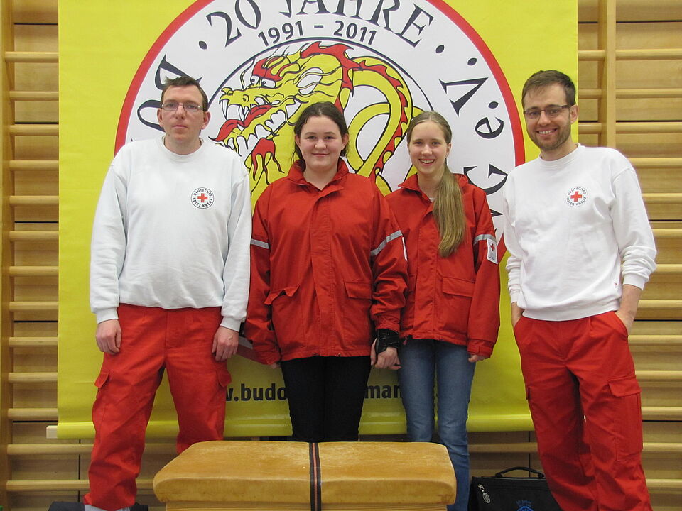 Sanitäter des BRK Ismaning sicherten die medizinische Betreuung der Sportler. Und die waren gleich zu viert gekommen; neben zwei erfahrenen Sanitätern leisteten die beiden Mitglieder der Ismaninger Rot Kreuz Jugend Michaele Huschka und Franziska Petersen eifrig Dienst. Deren Hilfe wurde auch gerne in Anspruch genommen, einige Sportler, die mit kleineren Blessuren aus dem Kampf kamen, suchten die Hilfe der jungen Sanitäterinnen gerne auf. Ernsthafte Verletzungen blieben jedoch aus, lediglich einmal mussten die Sanitäter auf das Feld, nachdem ein Kämpfer kurzzeitig regungslos liegen blieb. Nach kurzer Versorgung konnte er wieder auf die Beine gestellt und entlassen werden.