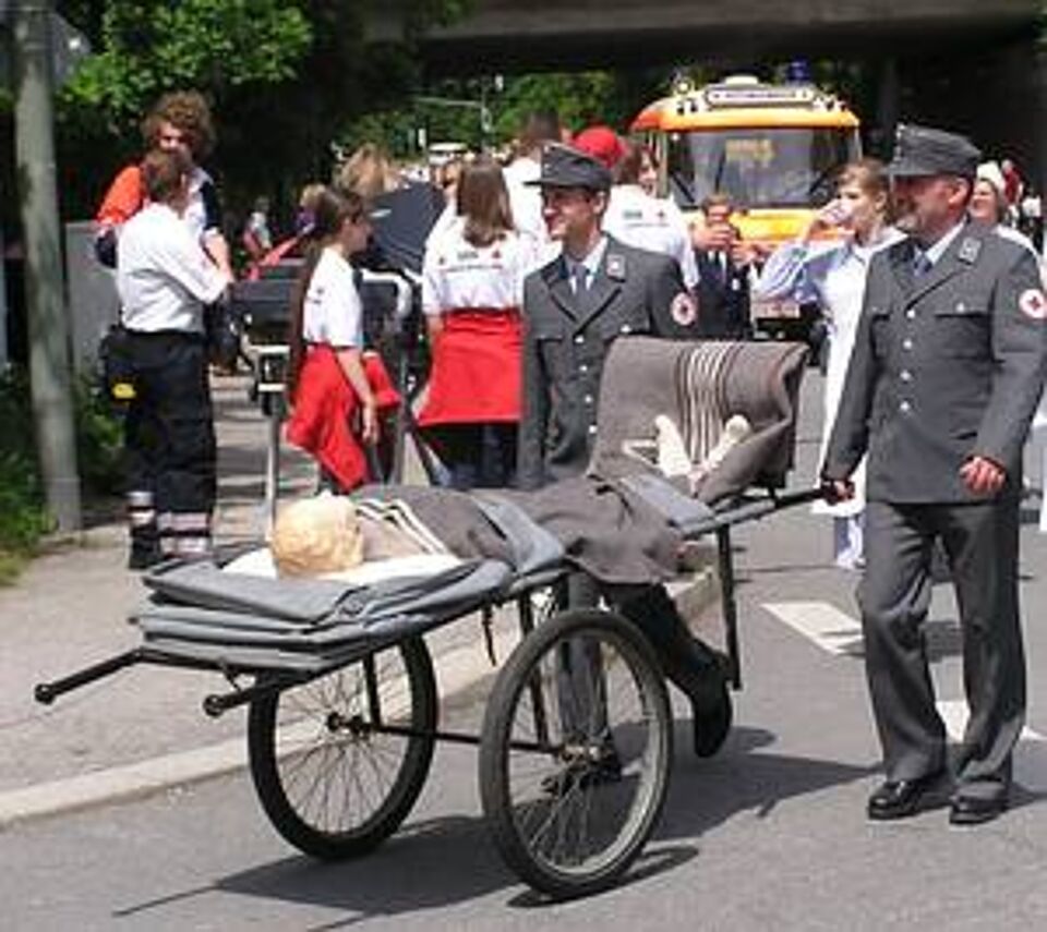 Rotkreuzmuseum zur Verfügung gestellte Rädertrage sowie der inzwischen 25 Jahre alte ehemalige Rettungswagen der Bereitschaft am Festzug teil.