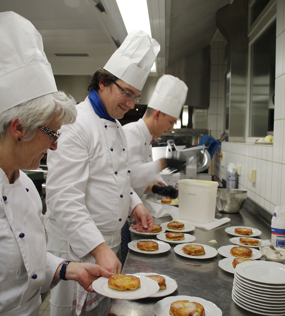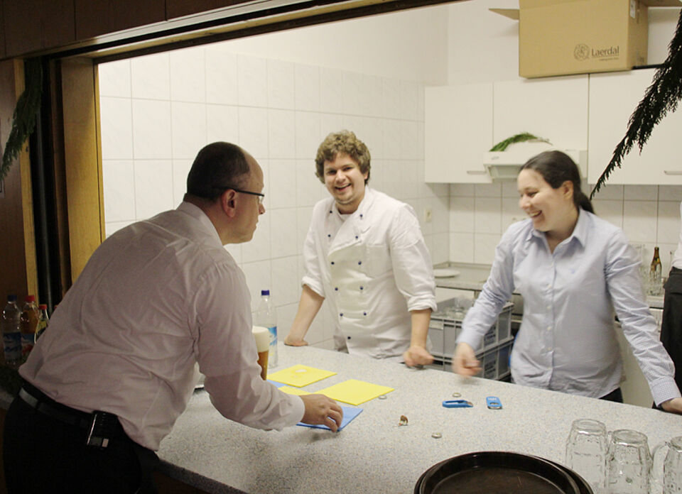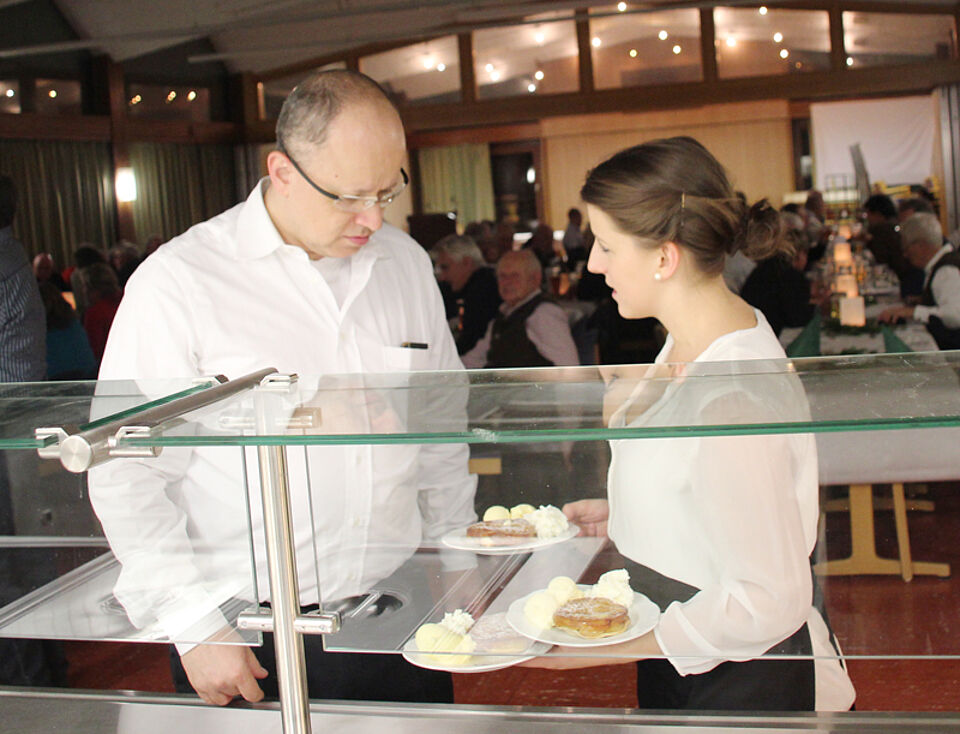 Das Küchenteam des Deisenhofener Roten Kreuzes hat am Donnerstag traditionell die Jahresabschlussfeier der Bergwacht des Münchner Roten Kreuzes bekocht. Um acht Uhr morgens begannen die ehrenamtlichen Helfer mit den Vorbereitungen in der Großküche der Kreisgeschäftsstelle. Sie schälten Kartoffeln für die Kartoffelsuppe, bereiteten verschiedene Canapés vor, stellten Käseplatten zusammen und legten die Abläufe fest. Anschließend bereiteten sie eine Gemüsequiche sowie Schweinebraten mit zweierlei Knödel, Blaukraut und Bratensauce für insgesamt 120 Personen vor. Um 18 Uhr kamen dann die Helfer für Ausschank, Ausgabe und Bedienung dazu, sodass zum Schluss 13 ehrenamtliche Helfer unter der Leitung von Sabine Wagmüller und ihrem Sohn Johannes im Einsatz waren. Neben Deisenhofener Rotkreuzlern waren auch je ein Helfer der Bereitschaft Süd2 und Dachau aktiv.