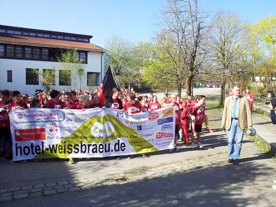 Am Freitag betreuten ehrenamtliche Helfer des Deisenhofener Roten Kreuzes den Afghanistantag am Gymnasium Oberhaching. Bereits am Vormittag begleiteten die Rotkreuzler mit ihrem Fahrzeug den Sponsorenlauf, bei dem die Schülerinnen und Schüler eifrig Spenden für das Krankenhaus im afghanischen Chak e Wardak sammelten.