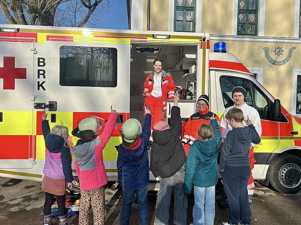 Neben der Besichtigung des Rettungswagens gaben die Einsatzkräfte den Kindern auch wichtige Hinweise zur Rettungskette, zu den Grundlagen der Anamnese sowie zur Notrufnummer 112, die essenziell ist, um im Notfall Hilfe holen zu können. „Keiner ist zu klein, um Helferin zu sein“, betont Maria Vogl vom Deisenhofener Roten Kreuz.