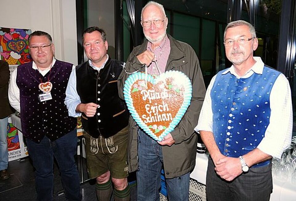 Bürgermeister Schmid dankte dem Jubilar für seine außerordentlichen Verdienste zum Wohle der Wiesnbesucher und überreichte ein großes Wiesnherz mit der Aufschrift 'Pfüad di Erich Schihan'. Jürgen Terstappen, Leiter der Wiesn-Sanitätsstation, übergab einen großen Geschenkekorb, gefüllt unter anderem mit Virginia-Zigarren, Schihans Erkennungszeichen, und sagte: 'Lieber Erich, danke für Alles, was du für das Münchner Rote Kreuz geleistet hast. Du gehst uns schon heute sehr, sehr ab im täglichen Wachbetrieb. Wir hoffen ganz stark, dass du dich künftig wieder mehr auf der Sanitätsstation sehen lässt. Du bist jederzeit herzlich willkommen, auch wenn wir Dich heute offiziell verabschieden.'