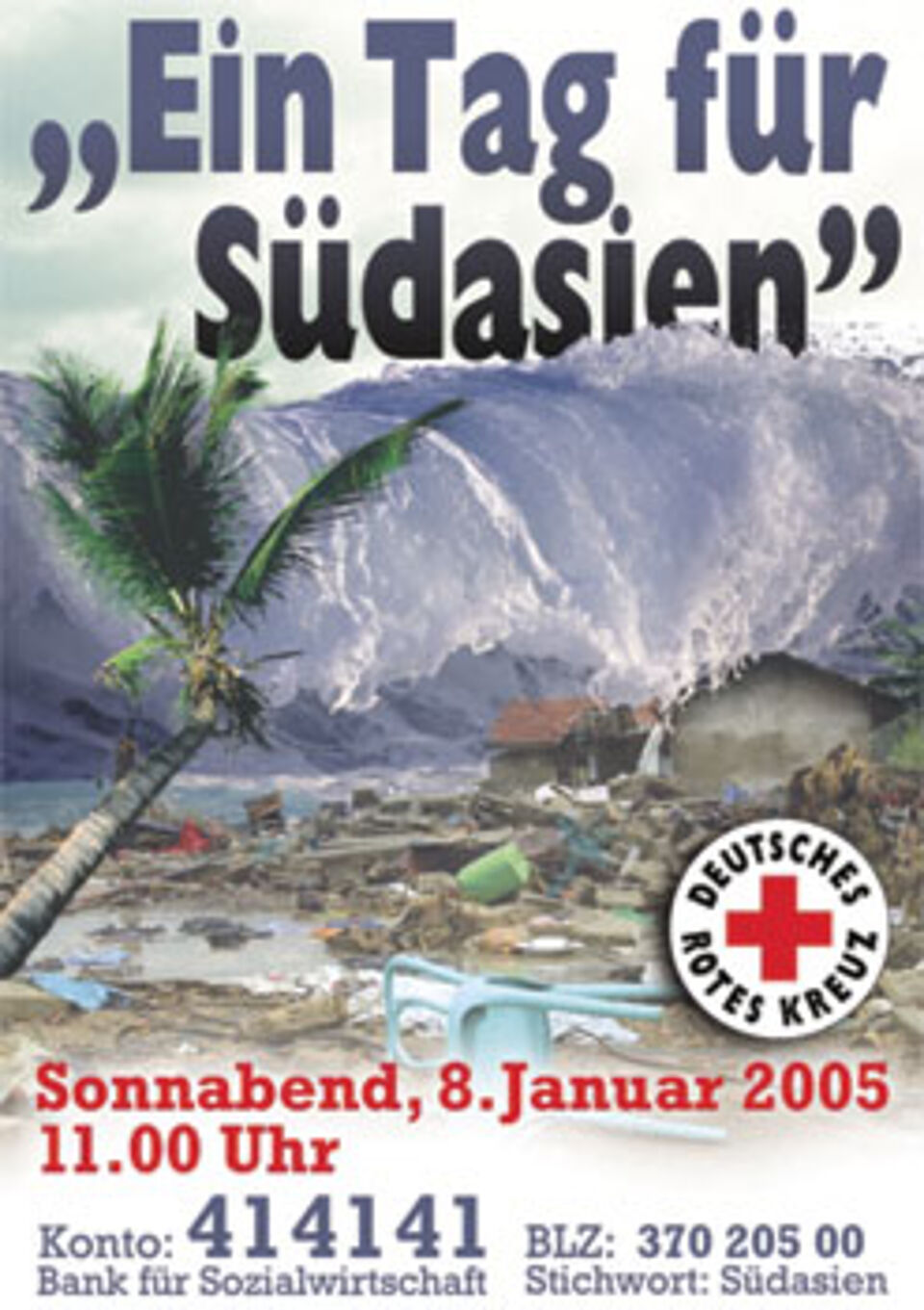 Angesichts der dramatischen Ereignisse in Südasien hat Präsident Dr. Seiters das gesamte Deutsche Roten Kreuz zu einer Spendensammelaktion zu Gunsten der Hilfe für die Opfer der Tsunami-Katastrophe aufgerufen. Die Aktion unter dem Motto „Ein Tag für Südasien“ findet bundesweit einheitlich am Samstag, den 8 Januar 2005, statt.