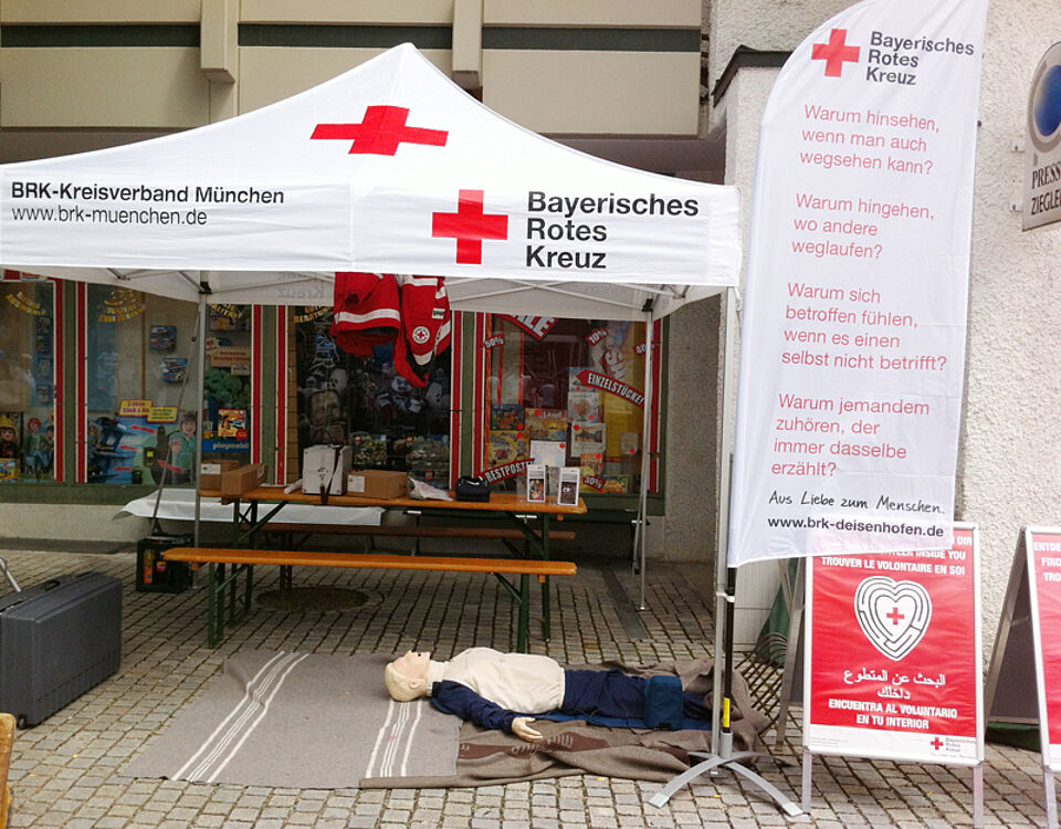 Im Mittelpunkt stand die Demonstration von Erste-Hilfe-Maßnahmen. Die Besucher hatten Gelegenheit, Wiederbelebung und Seitenlage zu üben und sich über das Defibrillationsprojekt der Gemeinde Oberhaching zu informieren. Vor allem die jüngeren Besucher waren daran sehr interessiert.