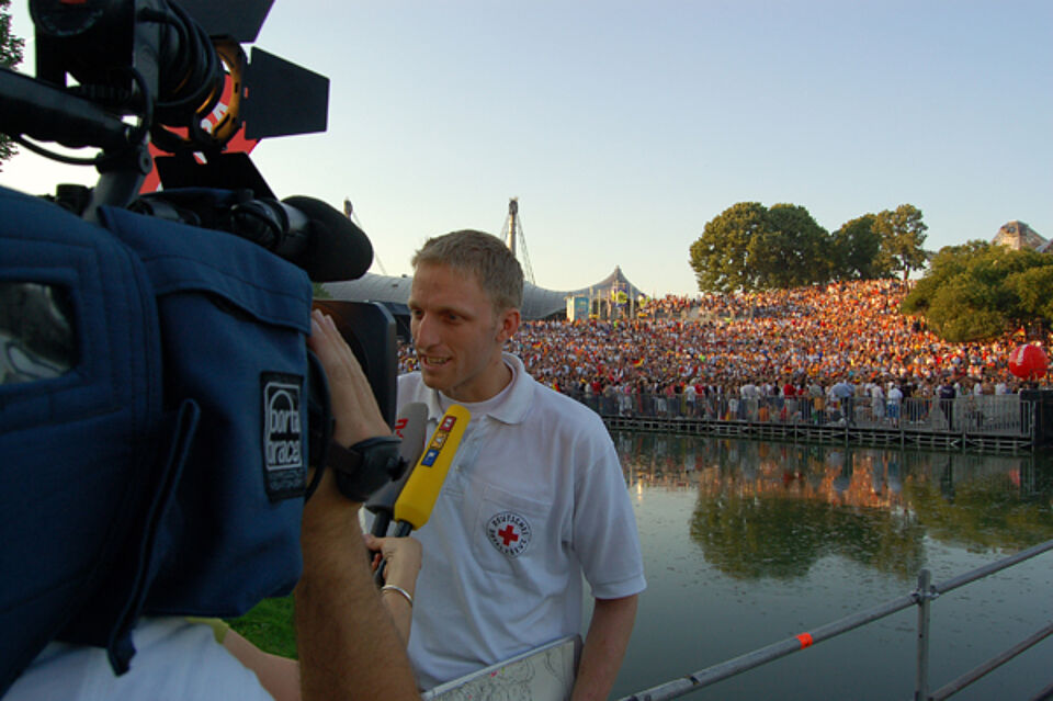 Unter öffentlicher Beobachtung arbeiten die ehrenamtlichen Helfer des Roten Kreuzes häufig. Selten aber sind Fernsehkameras dabei. Ralph Meyer und sein Einsatzteam nahmen am Mittwoch Reporter des Nachrichtensenders n-tv mit zu ihrer Arbeit im Münchner Olympiapark und ließen sich bereitwillig über die Schulter filmen.
