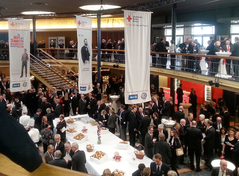 Rund 1800 Gäste waren der Einladung des Deutschen Roten Kreuzes gefolgt, darunter die baden-württembergische Ministerin für Arbeit und Sozialordnung, Familie, Frauen und Senioren, Katrin Altpeter, die DRK-Botschafterinnen Jette Joop und Jeanette Biedermann, Vertreter von Nichtregierungsorganisationen und internationaler Rotkreuz-Schwesterorganisationen, Unternehmenspartnern, DRK-Landesverbänden und der Blutspendedienste. Bundeskanzlerin Angela Merkel schickte eine Videobotschaft. Durch das Programm mit Beiträgen des Landesjugendorchesters, des Bundesjugendballetts und des Schüler- und Jugendchors „Gospel Train“ aus Hamburg-Harburg führten die DRK-Botschafter Carmen Nebel und Jan Hofer.