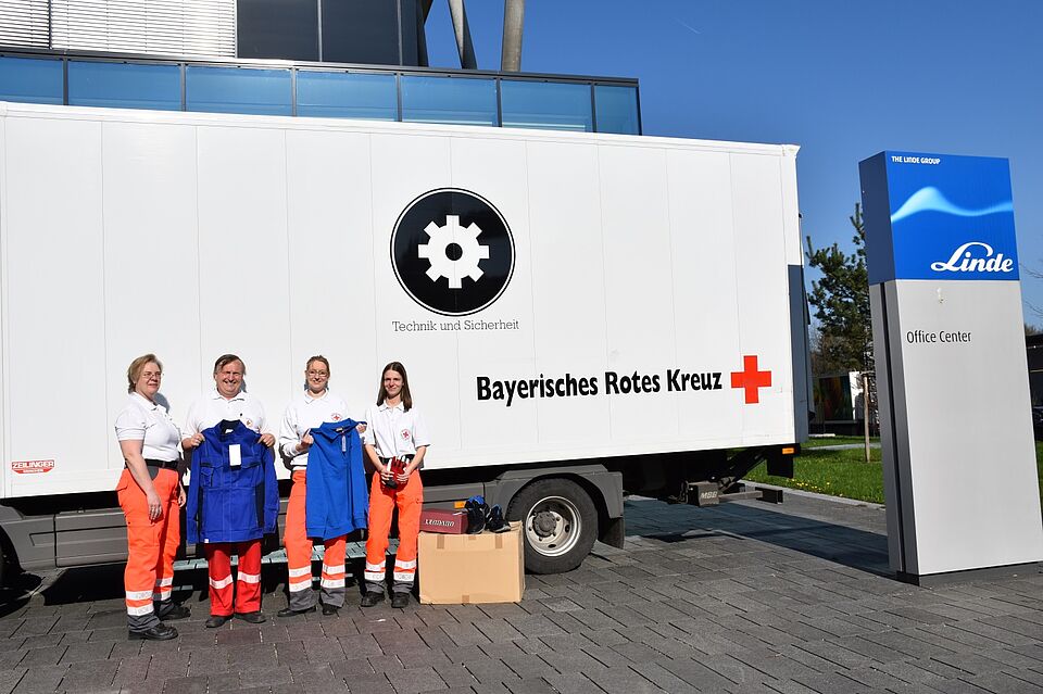 Durch eine Mitarbeiterin der Firma Linde, die sich zugleich ehrenamtlich im Fachdienst Technik und Sicherheit des Münchner Roten Kreuzes engagiert, bekamen die Mitglieder des Fachdienstes eine komplette Ausstattung an Arbeitskleidung. Die Firma Linde spendete für jedes Mitglied eine Arbeitsjacke, Hose, Shirt, Sicherheitsschuhe und Arbeitshandschuhe.