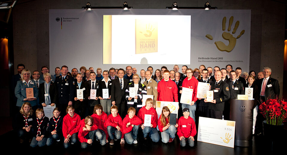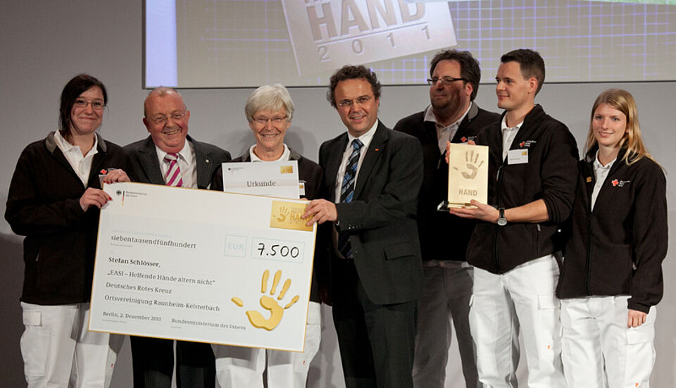 Die „Helfende Hand“ ist ein Förderpreis, den das Bundesinnenministerium jährlich vergibt. Bundesinnenminister Dr. Hans-Peter Friedrich zeichnet damit Ideen und Konzepte aus, die das Interesse der Menschen für ein ehrenamtliches Engagement im Bevölkerungsschutz wecken. Der Förderpreis ist insgesamt mit 27.000 Euro dotiert. Das Projekt EASI erhält 7.500 Euro für den ersten Preis.