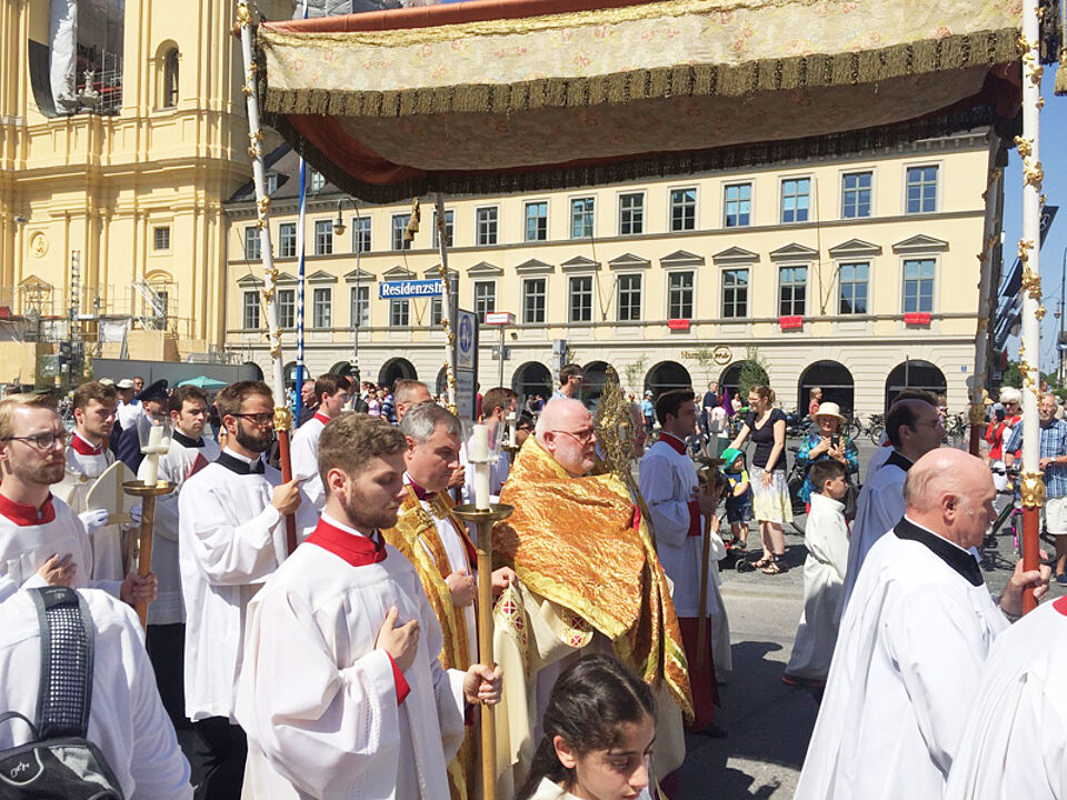 Das Münchner Rote Kreuz sorgte während der gestrigen zentralen Fronleichnamsprozession in der Landeshauptstadt mit 35 Helfer*innen und zwei Ärzten an acht Sanitätsstationen für die Sicherheit der Prozessionteilnehmer*innen. Zwei Stationen besetzten die Kollegen des Malteser Hilfsdienstes. Bei strahlendem Sonnenschein nahmen etwa 10.000 Menschen an der Prozession teil.