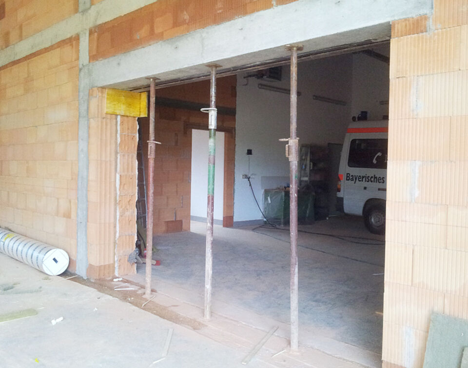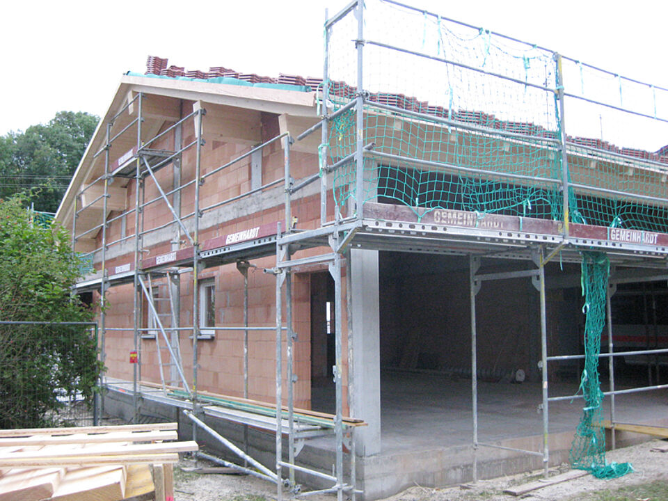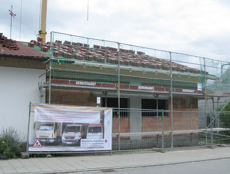Der Garagenanbau am Deisenhofener Rotkreuzhaus macht große Fortschritte: In der vergangenen Woche haben die Bauprofis die Außenmauern hochgezogen, den Durchbruch zur Bestandsgarage hergestellt und den kompletten Dachstuhl gezimmert.