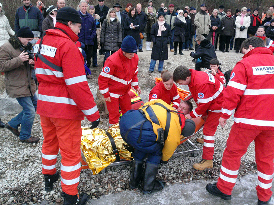 Auf großes Interesse stieß heute eine Demonstration der Kreiswasserwacht München in Zusammenarbeit mit der Wasserwacht Ortsgruppe Feldkirchen am Heimstettner See. Vor großem Publikum und Pressevertretern zeigte die Wasserwacht, welche Maßnahmen zu ergreifen sind, falls Personen auf einer Eisfläche einbrechen.