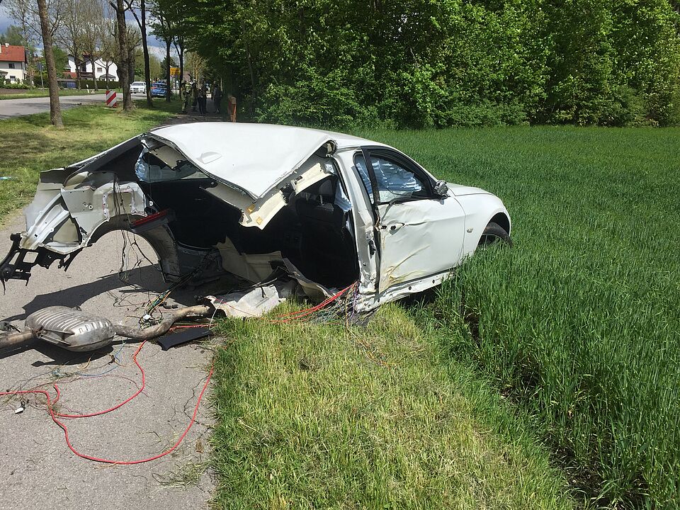 Als die Helfer um kurz nach 13 Uhr die Unfallstelle an der Freisinger Straße erreichten bot sich ihnen ein dramatisches Bild: Der 18-jährige Fahrer eines 3er BMW hatte, vermutlich in Folge überhöhter Geschwindigkeit, die Kontrolle über sein Fahrzeug verloren, kam von der Fahrbahn ab und tuschierte seitlich einen Baum. Durch die Wucht des Aufpralls wurde das komplette Heck samt Hinterachse aus dem Fahrzeug gerissen. Nur mit viel Glück erlitten Fahrer und Beifahrer keine lebensbedrohlichen Verletzungen. Beide wurden von den Sanitätern des BRK Ismaning versorgt und anschließend von zwei Rettungswägen zur weiteren Versorgung in Münchner Krankenhäuser transportiert.