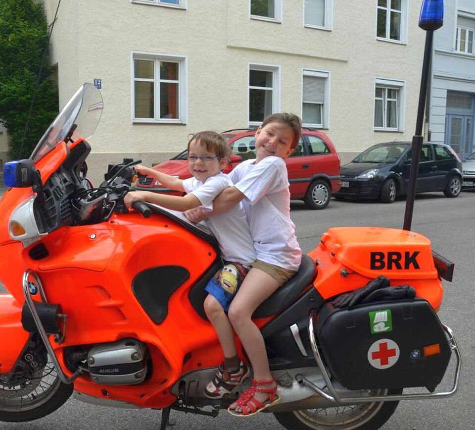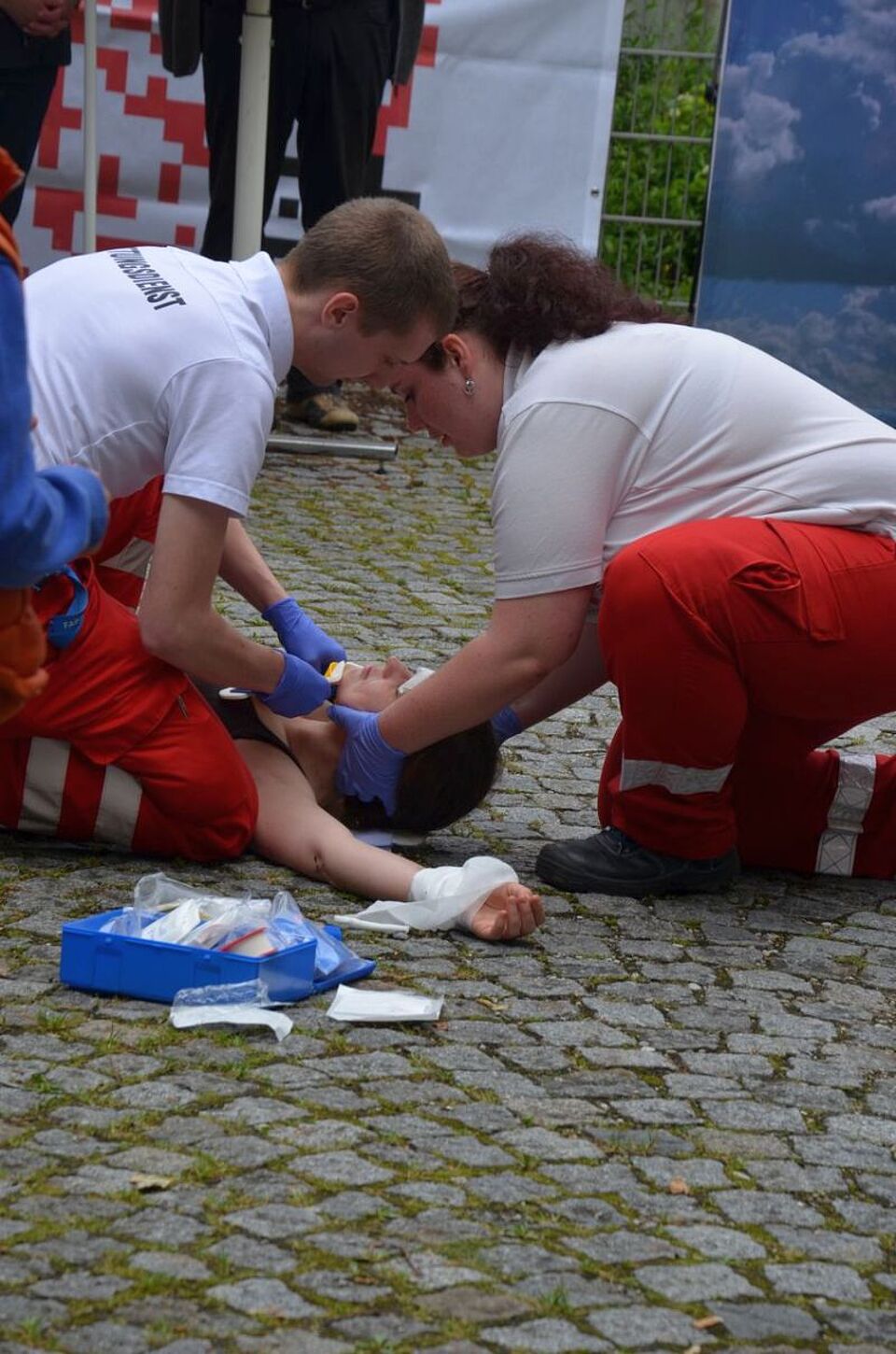 Doch nicht nur den jüngeren Münchnern gewährte die BRK-Bereitschaft einen intensiven Einblick in ihre tägliche Arbeit. Am Samstag konnten sich auch alle anderen Interessierten vor Ort ein Bild von den Tätigkeitsfeldern der Ehrenamtlichen machen. In den sogenannten Leistungsschauen inszenierten die Bereitschafts-Mitglieder verschiedene Notfallsituationen und Sanitätseinsätze. So wurden u. a. ein Fahrrad- und ein Grillunfall mithilfe von Mimen nachgestellt und ein großangelegter Autounfall simuliert, bei dem die Helfer das gesamte Erste-Hilfe-Spektrum vom Verbandanlegen bis hin zur Wiederbelebung und Intubation präsentierten. Darüber hinaus hatten die Gäste die Möglichkeit, selbst einmal Blutdruck-Manschette und Blutzucker-Messgerät in die Hand zu nehmen und auszuprobieren. „Vor allem die Herz-Lungen-Wiederbelebung und die AED-Geräte haben unsere Besucher stark beeindruckt“, so Koos. „So hatte zwar jeder schon mal einen Defibrillator in den U-Bahn-Stationen oder verschiedenen öffentlichen Einrichtungen gesehen, die Hemmschwelle, die Geräte tatsächlich einzusetzen, ist bei den meisten aber leider sehr groß. Dabei könnten viele Leben durch den beherzten Einsatz eines AEDs gerettet werden.“ Die Besucher nutzten daher die Gelegenheit und machten sich unter Anleitung der Rot-Kreuz-Sanitäter mit den Defibrillatoren vertraut.