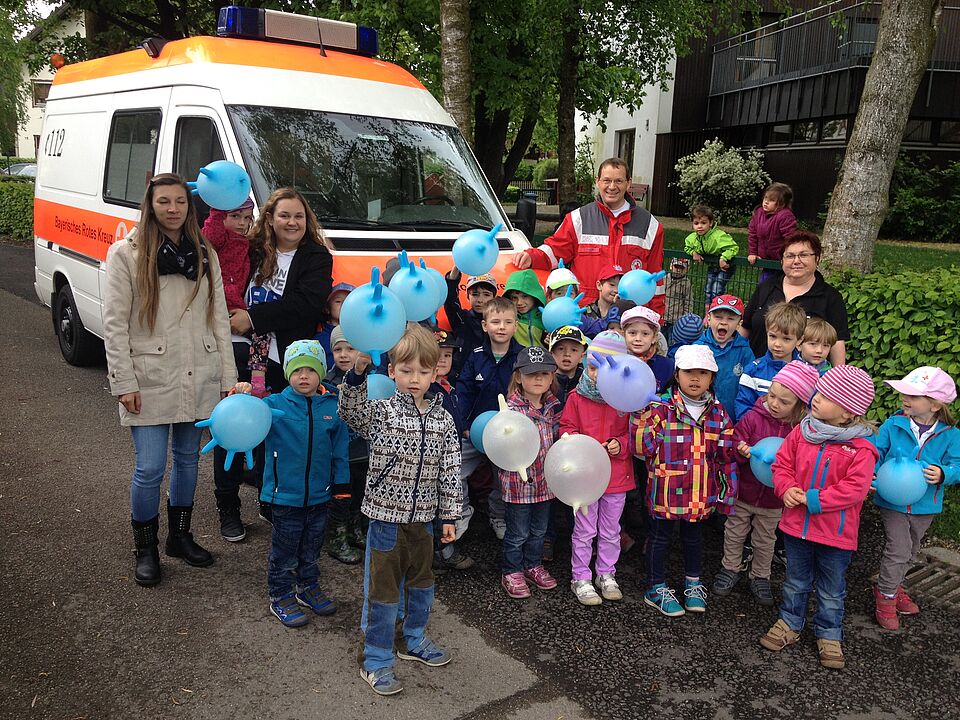 Am Freitag war es dann soweit, das Bayerische Rote Kreuz (BRK) Ismaning stand mit einem Rettungswagen vor der Tür. Alle Kinder durften in den Krankenraum des Rettungswagens steigen und Fried Saacke, Leiter des BRK Ismaning zeigte den interessierten Kindern die Einrichtung und Ausstattung des Fahrzeugs sowie die medizinischen Geräte. "Wofür ist das denn", fragte ein Mädchen und zeigte auf einen Gegenstand. "Mit diesem Gerät können wir dem Patienten Sauerstoff geben" antwortete Saacke, "den geben wir den Kranken, damit sie leichter Atmen können". Saacke zeigte den Kindern wie das funktioniert und alle hörten interessiert zu. So wurde der Rettungswagen Stück für Stück erkundet.