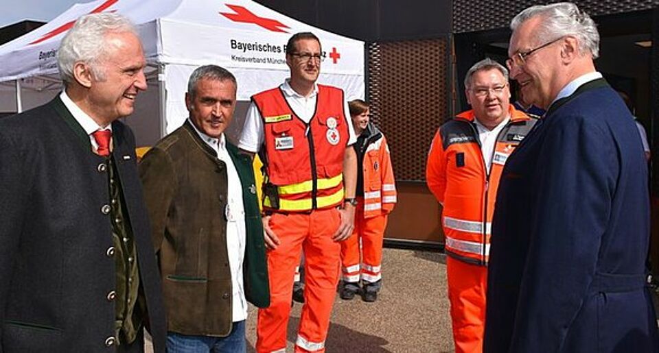 Gestern stattete der Bayerische Innenminister Joachim Herrmann den Ärzten und ehrenamtlichen Einsatzkräften des Münchner Roten Kreuzes auf der Wiesn einen Besuch ab. Karl-Heinz Demenat, Vorsitzender des Münchner Roten Kreuzes, und Jürgen Terstappen, Leiter der Wiesn-Sanitätsstation, erläuterten die verschiedenen Bereiche der BRK-Sanitätsstation im Servicezentrum Theresienwiese. Innenminister Herrmann informierte sich ausführlich über die optimierten Abläufe und Einsatzzahlen und war beeindruckt: "Ein ganz außergewöhnlicher Einsatz mit enormer Professionalität und viel ehrenamtlichem Engagement".