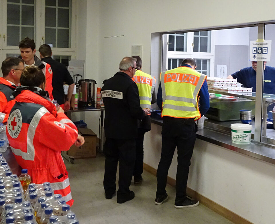 SEG Verpflegung und der Fachdienst Psychosoziale Notfallversorgung (PSNV) in der Nacht im Einsatz. Die PSNV-Helfer*innen übernahmen Aufgaben der Krisenintervention und standen auch für die Einsatzkräftenachsorge bereit. Der Betreuungsdienst war an einer Betreuungsstelle im Luisengymnasium im Einsatz.