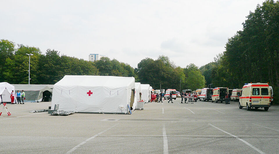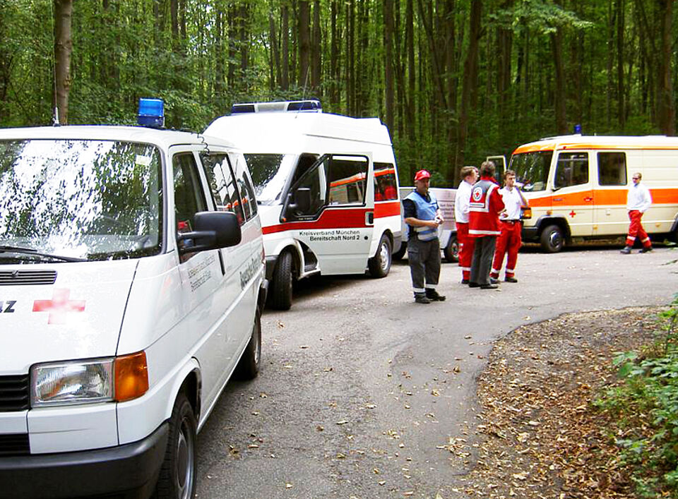 Das Ergebnis: Das Sammeln und die Anfahrt der überörtlichen Helfer braucht seine Zeit, der Behandlungsplatz ist dann jedoch in weniger als einer halben Stunde einsatzklar. Die Münchner Helfer der Bereitschaften Haar, Nord2, Ober- und Unterschleißheim bauten ein Sichtungszelt am Eingang des Behandlungsplatzes auf dem Parkplatz Schloß Grünau auf. Darin werden im Einsatzfall die Patienten kurz untersucht und je nach Schweregrad ihrer Verletzung in den jeweiligen Behandlungsbereich gebracht. Für die Übung gab es jedoch keine Verletztendarsteller, da nur die Alarmierung, die Abläufe und die Aufbauzeit überprüft werden sollten.