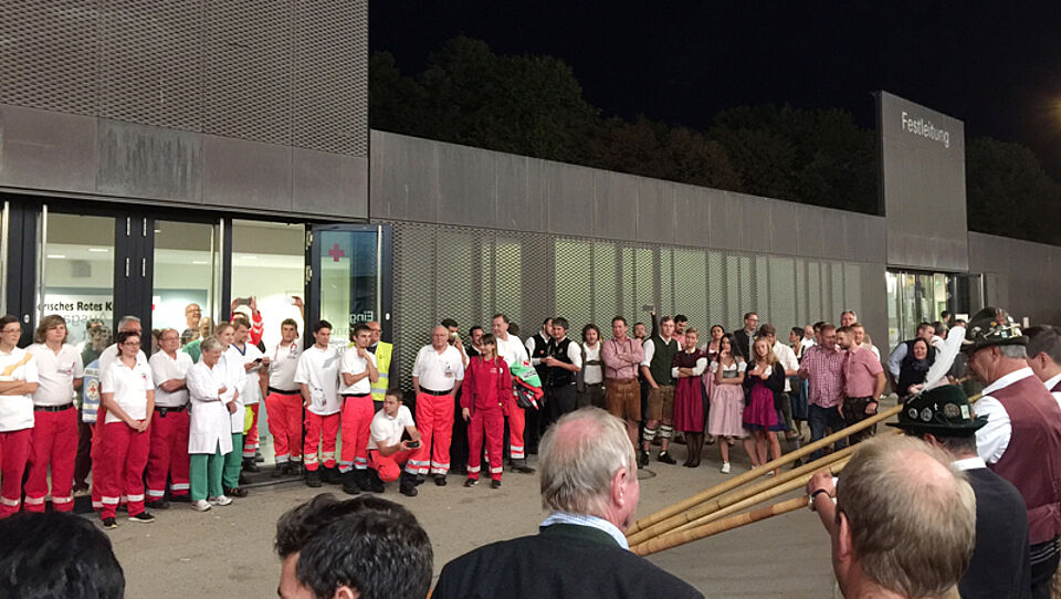 Die Kaufbeurer Alphornbläser haben sich heute Abend mit einem kleinen Ständchen bei den Einsatzkräften des Bayerischen Roten Kreuzes für deren wertvollen Dienst auf der Wiesn bedankt. Direkt vor dem Eingang "Erste Hilfe" des Servicezentrums Theresienwiese zeigten die Bläser ihr Können. Interessierte Zuhörer fanden sich nicht nur unter den Einsatzkräften. Auch viele Wiesnbesucher hörten zu und klatschten Beifall.