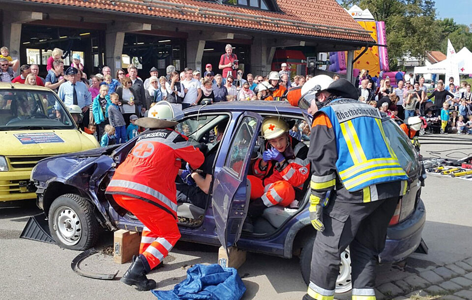 Beim Tag der offenen Tür der Freiwilligen Feuerwehr Oberhaching waren auch ehrenamtliche Helfer des Deisenhofener Roten Kreuzes aktiv. Für das Einsatzbeispiel "Verkehrsunfall" unterstützten sie die Kollegen bei der Rettung von zwei Verletztendarstellern aus einem Unfallauto. Zudem informierten sie an einem Infostand über die Aufgaben des Roten Kreuzes in Oberhaching und Erste-Hilfe-Themen. Besonders beliebt bei den kleinen Besuchern war das Wundenschminken, das das Jugendrotkreuz übernahm.