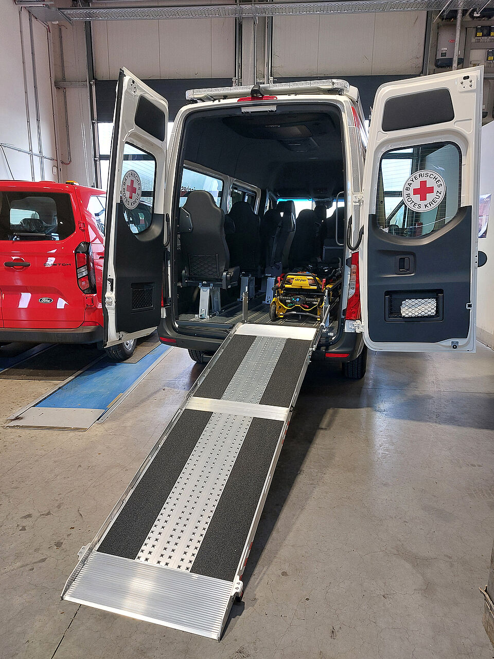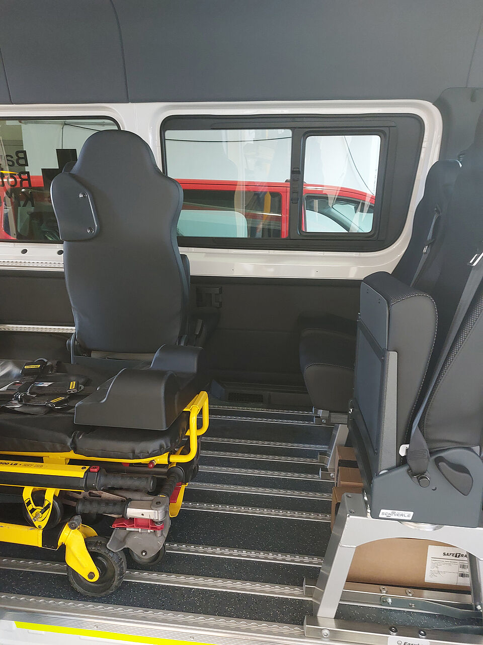 In Bingen ersetzte ein Fahrzeugbauunternehmen mit Spezialisierung auf Behindertentransportfahrzeuge den Originalboden des Fahrgastraumes mit einem Systemboden mit sogenannten Airlineschienen. Diese Schienen ermöglichen das maximal flexible und sichere Fixieren der bis zu 6 Einzelsitze, maximal zwei Rollstühlen oder beliebiger Ladung. Auch die noch ausstehenden Möbel sollen auf den Schienen fixiert werden. Dabei handelt es sich um einen Schrank für das medizinische und sonstige Material und einen Tisch für den Aufenthalt bei Veranstaltungen und zur Koordination und Dokumentation von Einsätzen. Die Möbel werden leider erst 2025 fertig.
