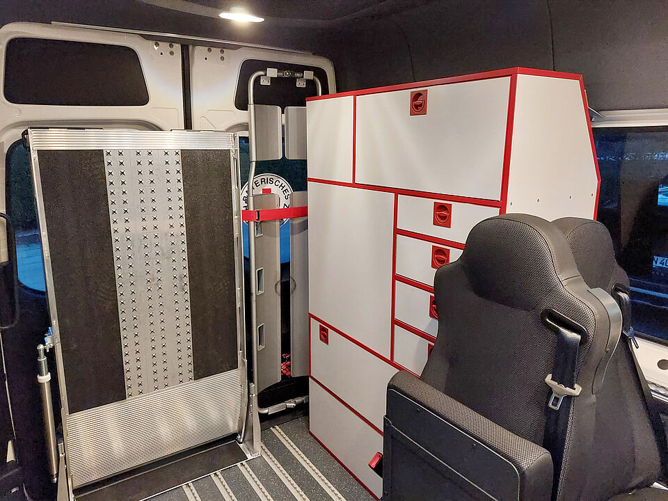 Das Herz des Fahrzeugkonzepts bildet der Systemboden, der eine maximal flexible Positionierung von Sitzen, Tisch, Möbeln, einer Trage oder bis zu zwei Rollstühlen, aber auch die professionelle Sicherung von Ladung ermöglicht. Der Tisch und ein Materialschrank wurden nach individuellen Vorgaben hergestellt und eingebaut, ein Kommunikationsplatz im Fahrgastraum eingerichtet und alle Einbauten von einem Gutachter geprüft und abgenommen.