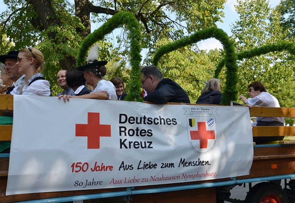 Rund 130 ehrenamtliche Helfer und durchschnittlich 20.000 freiwillige Dienststunden pro Jahr – das sind die Eckdaten, die Münchens größte Rotkreuz-Bereitschaft auszeichnen. Dementsprechend groß war die Jubiläumsfeier zum 80. Geburtstag, zu der die Bereitschaftsmitglieder am vergangenen Samstag Gäste aus dem Roten Kreuz, der Freiwilligen Feuerwehr, der Polizei und Münchner Trachtenvereinen sowie Politiker aus Stadt und Land in den Stadtbezirk Neuhausen-Nymphenburg einluden. Ausgangspunkt der Feierlichkeiten war ein Festgottesdienst mit anschließender Fahrzeugsegnung in der Pfarrei Christkönig (Notburgastraße). Von dort aus ging es mit einem Fahnenumzug vorbei am Nymphenburger Schloss und anschließend auf der Hirschgartenallee bis zum „Königlichen Hirschgarten“. Angeführt wurde der Umzug unter den Augen von zahlreichen Schaulustigen von der Musikkapelle des Bayerischen Roten Kreuzes. Beim Eintreffen am südlichen Haupteingang des Biergartens begrüßten Böllerschützen die Rotkreuzler und ihre Gäste und wurden dafür mit einem Applaus der anwesenden Biergartenbesucher belohnt.
