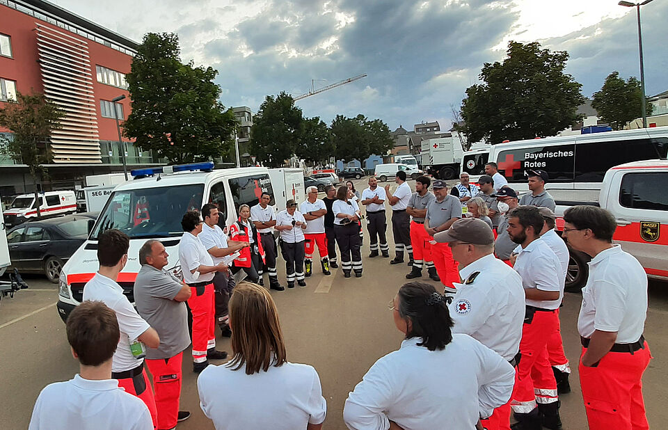 Als am Donnerstag der Einsatzbefehl kam, machten sich die Helfer*innen der Bereitschaften Deisenhofen, Perlach und Zentral 2 sofort an die Planung. Sie stellten das Einsatzteam zusammen, beluden die Fahrzeuge, stimmten sich mit ihren Arbeitsgebern ab und packten ihr Einsatzgepäck. Am Freitag um 4:30 Uhr morgens ging es dann mit drei Fahrzeugen und einem Materialanhänger nach Greding, wo sich sie Einsatzkräfte aus ganz Oberbayern trafen. 68 ehrenamtliche Einsatzkräfte von Rotem Kreuz, Arbeiter-Samariter-Bund, Johanniter-Unfallhilfe und Malteser Hilfsdienst untern anderem aus München, Allerdhausen, Bad Tölz, Erding, Berchtesgaden, Weilheim und Landsberg machten sich nach Rheinland-Pfalz auf den Weg.
