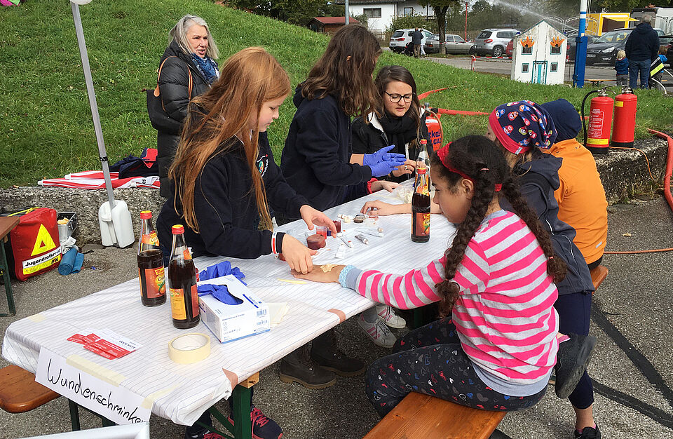 Die ehrenamtlichen Rotkreuzler*innen beteiligten sich mit einem Infostand und ließen die Besucher*innen den ganzen Tag über die Wiederbelebung an einer Puppe üben. Das Jugendrotkreuz war nebenan im Dauereinsatz, um den Kindern möglichst dramatische Wunden zu schminken. Die Feuerwehr bot ein buntes Programm von Fahrzeugschau über Feuerlöschertraining und Brandsimulationen bis hin zu Livemusik und Grillfleisch.