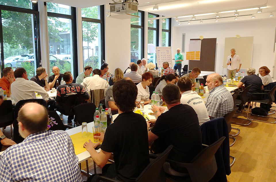 Am 21. Juli fand in den Räumen der Kreisgeschäftsstelle ein Zukunftsworkshop der ehrenamtlichen Leitungskräfte aller fünf Rotkreuzgemeinschaften statt. Rund 50 Vereinsmanager*innen aus Bereitschaften, Bergwacht, Jugendrotkreuz, Wasserwacht und Wohlfahrts- und Sozialarbeit machten sich in einem intensiven Tag Gedanken über die Zukunft der ehrenamtlichen Rotkreuzarbeit in Stadt und Landkreis München. Eingeladen hatte der Vorstand des Münchner Roten Kreuzes, weshalb neben dem Vorsitzenden Karl-Heinz Demenat und seiner Stellvertreterin Sabine Wagmüller auch etliche weitere Vorstandsmitglieder teilnahmen.