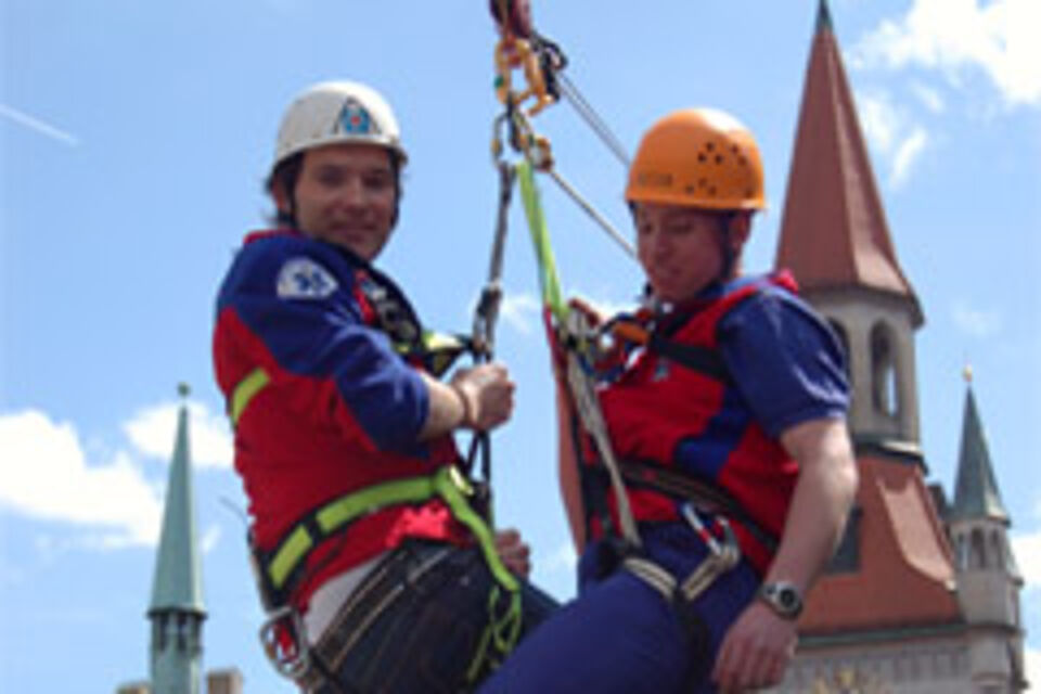 Zahlreiche Attraktionen warteten auf die Besucher des großen Aktionstages des Münchner Roten Kreuzes, der am Samstag 12.05.07 auf dem Marienplatz statt fand. Gast des Aktionstags war ZDF-Moderator Ingo Nommsen („Hallo Deutschland“, „Volle Kanne“), der sich von Thomas Hackl von der Münchner Bergwacht wagemutig vom Turm des Alten Rathauses über den Köpfen der Münchner ca. 50 Meter weit bis auf Höhe der Mariensäule abseilen ließ.