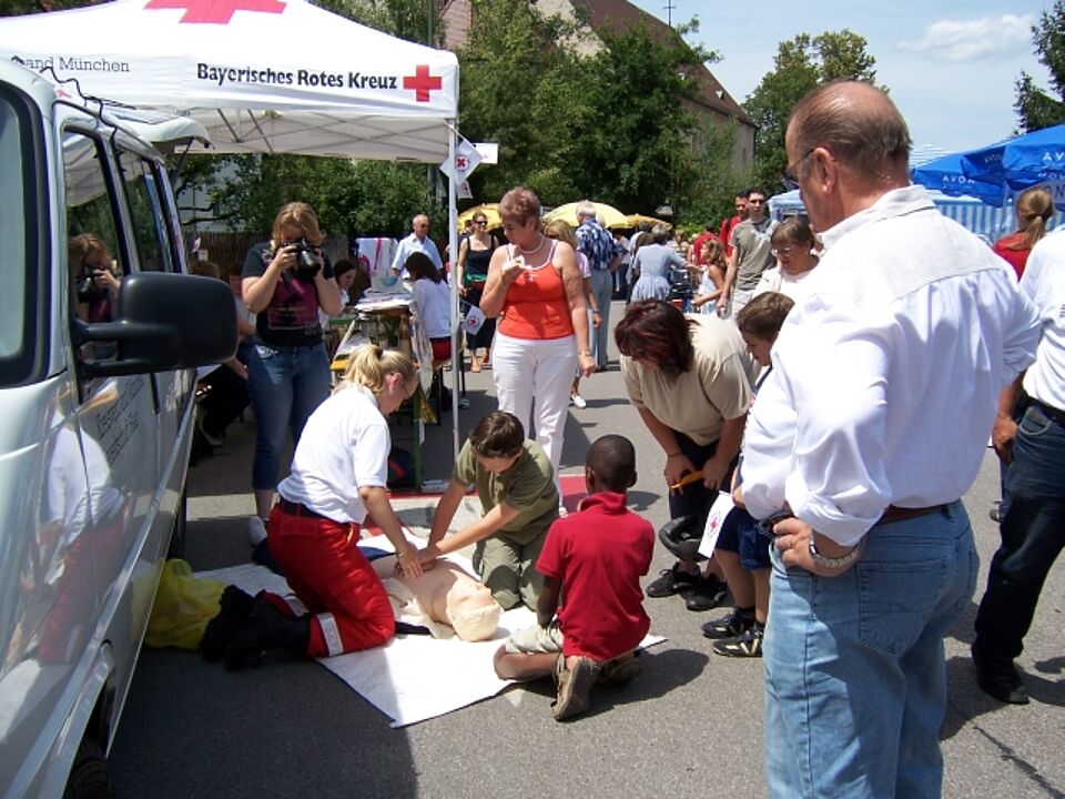 Während sich die Kinder begeistert vom Schminktrupp unter Leitung von Andi Fröhlich überzeugend wirkende Wunden schminken ließen, konnten sich die Erwachsenen beim Gesundheitscheck den Blutduck und Blutzucker bestimmen lassen. Auch die Erste-Hilfe-Vorführung an der Wiederbelebungs-Puppe nahmen viele gleich zum Anlaß, selber zu üben und sich auch über aktuellen Erste-Hilfe-Kursen zu informieren.