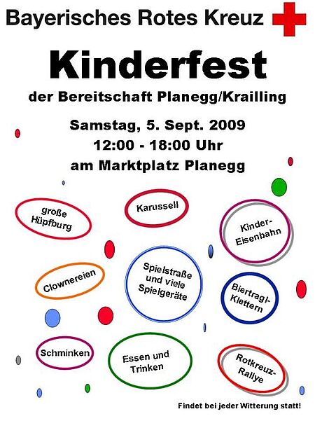 Die Bereitschaft Planegg/Krailling lädt alle Kinder und ihre Eltern zum traditionellen Kinderfest am kommenden Samstag (5. September) von 12 bis 18 Uhr auf den Planegger Marktplatz ein.