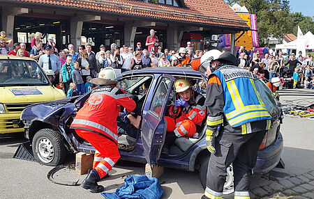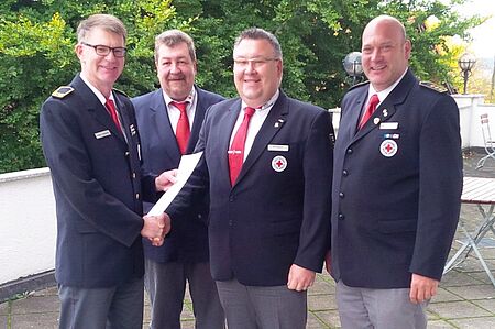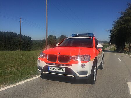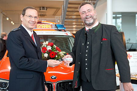 Die Mitglieder der Bereitschaft Ismaning des Münchner Roten Kreuzes freuen sich über das neue Einsatzfahrzeug für den Helfer vor Ort, einen BMW X3. Bürgermeister Dr. Alexander Greulich übergab am Samstag die Schlüssel an Fried Saacke, Leiter der Bereitschaft Ismaning.
